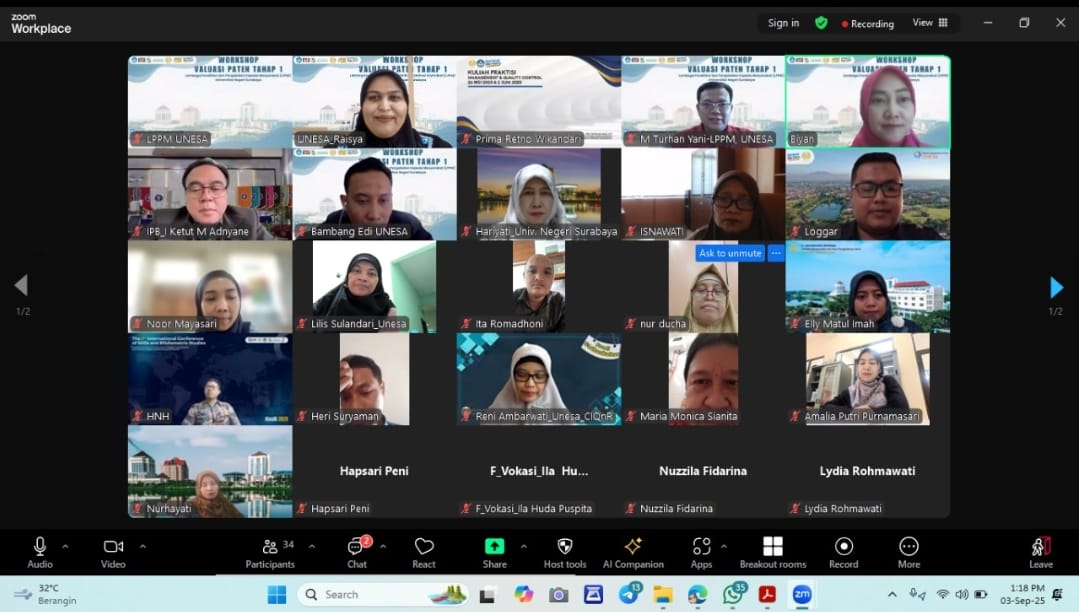 Surabaya, 3 September 2025 — Lembaga Penelitian dan Pengabdian kepada Masyarakat (LPPM) Universitas Negeri Surabaya (UNESA) menyelenggarakan Workshop Valuasi Paten secara daring pada Rabu, 3 September 2025. Acara ini dipandu oleh Raissa, PIC HKI Fakultas Ilmu Keolahragaan dan Kesehatan (FIKK), serta diikuti oleh 50 dosen inventor paten UNESA. Kegiatan ini menjadi langkah penting dalam meningkatkan pemahaman sivitas akademika mengenai valuasi kekayaan intelektual (KI) guna mendukung hilirisasi hasil penelitian. Selain itu, turut diundang Direktur Keuangan UNESA, Direktur Inovasi dan Pemeringkatan, serta Direktur Badan Pengelola Usaha (BPU) UNESA untuk memperkuat sinergi dalam mewujudkan komersialisasi hasil riset yang berpotensi menghadirkan income generating bagi universitas. Hal ini sebagaimana disampaikan oleh Biyan Yesi Wilujeng, selaku moderator dan Kepala Sentra KI LPPM UNESA.